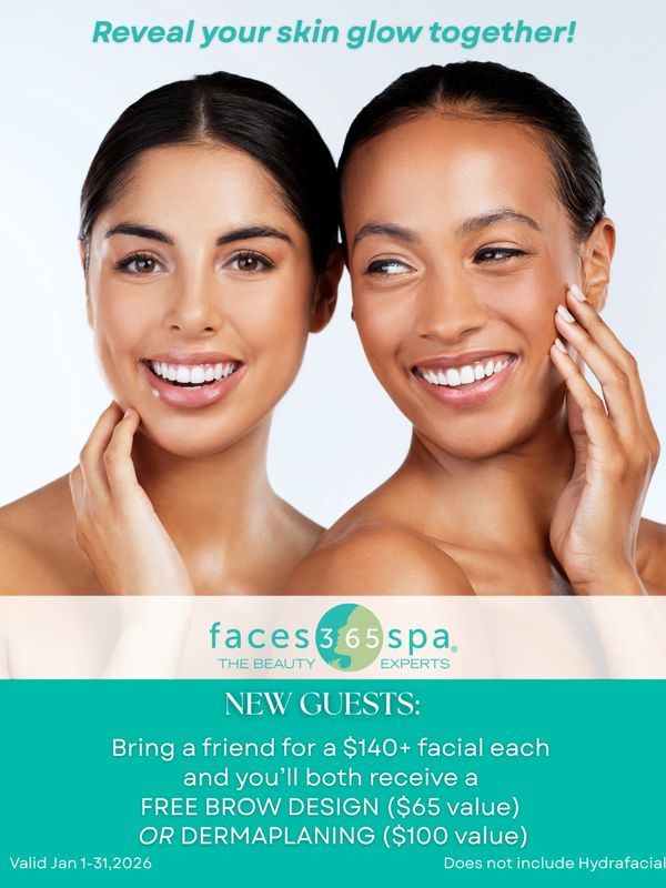 Bring a friend for a $140+ facial each and you'll both receive a free brow design or dermaplaning. Does not include Hydrafacials.